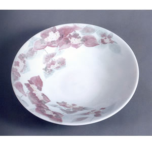 白磁に映える釉裏紅の美しさをテーマとして、作陶しております。釉裏紅は中国元代に起源する技法で、不安定な発色です。しかし紅や緑の発色は千変万化の表情を見せてくれます。この無限の可能性を持つ釉裏紅の仕事はとても楽しいものです。