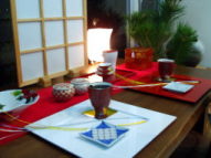 | 陶器の干支(戌)の置物や、ちりめん細工のお飾り(しめ飾り・リース等)、お正月の暖簾・タペストリーを展示致します。 |